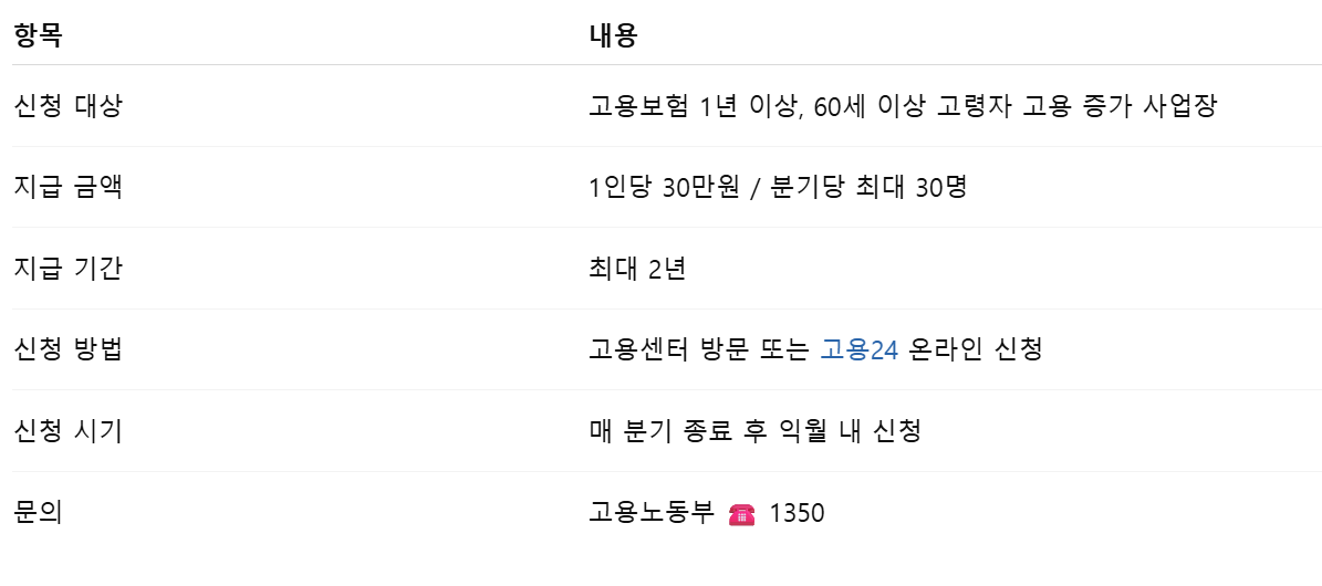 처음에는 저도 “이게 구직자용인가? 기업 지원인가?” 헷갈렸는데, 알고 보니 60세 이상 근로자 수가 늘어난 사업장에 정부가 직접 돈을 지원해주는 제도더라고요.