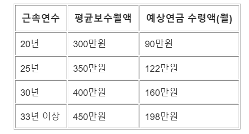 - 재직기간: 최소 10년 이상이어야 수령 가능하며, 20년 이상일 경우 더 높은 수령 가능