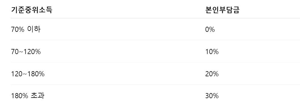 - 중위소득에 따라 본인부담금 다름 → 기초수급자 0원