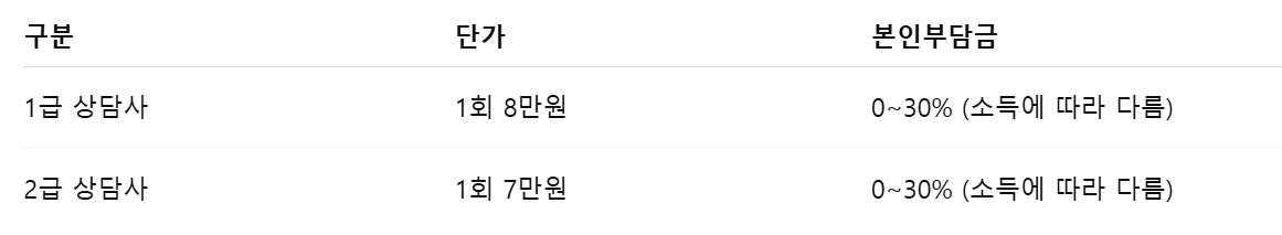 ※ 상담사는 1급과 2급으로 나뉘며, 가격도 다소 차이 있습니다 (1회당 7~8만원 수준)